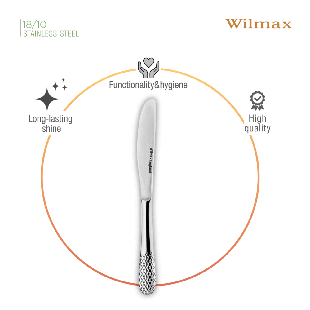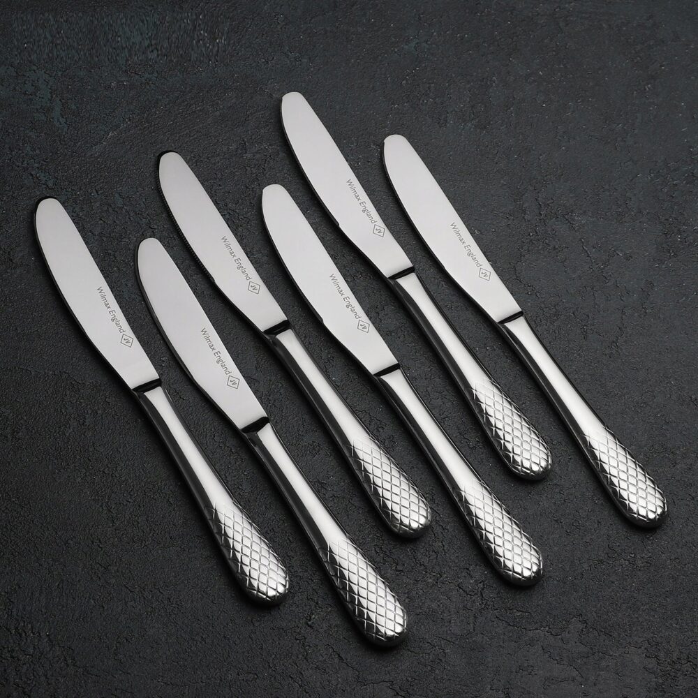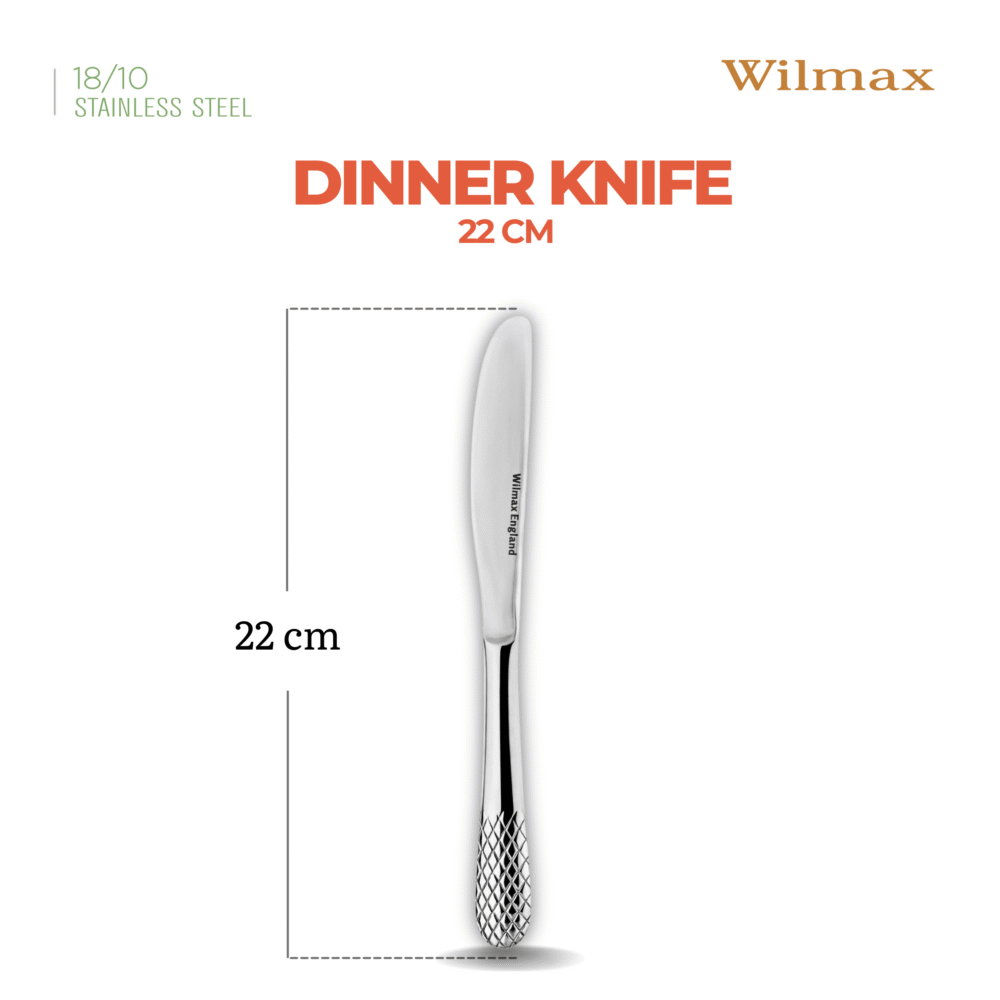 Dinner knife 22 cm – set of 6 pieces WL-999200/6C is an elegant proposition for connoisseurs of excellent design and functionality. Created from the highest quality 18/10 stainless steel, it is characterized not only by an aesthetic appearance, but also by durability and ease of cleaning, making it an excellent choice for everyday use and special occasions. A classic table knife with a unique relief pattern from the JULIA collection fits into an elegant and modern style of table setting, coordinating perfectly with porcelain and bamboo products from WILMAX.