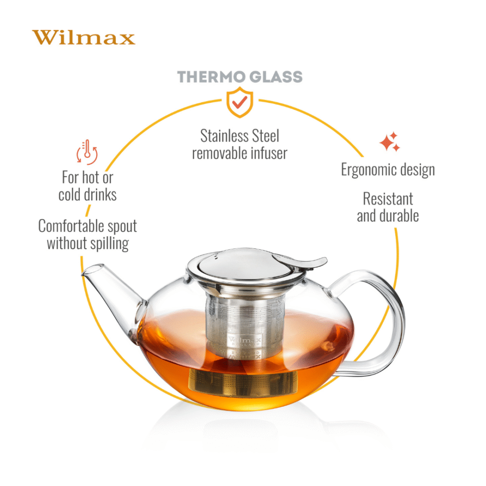 Product features: dishwasher safe (except metal lid), material: high-quality glass, finish: glossy, number of pieces: 1 pcs. Thanks to its classic design, the Wilmax teapot will be a perfect addition to any table, highlighting the elegance of served beverages.