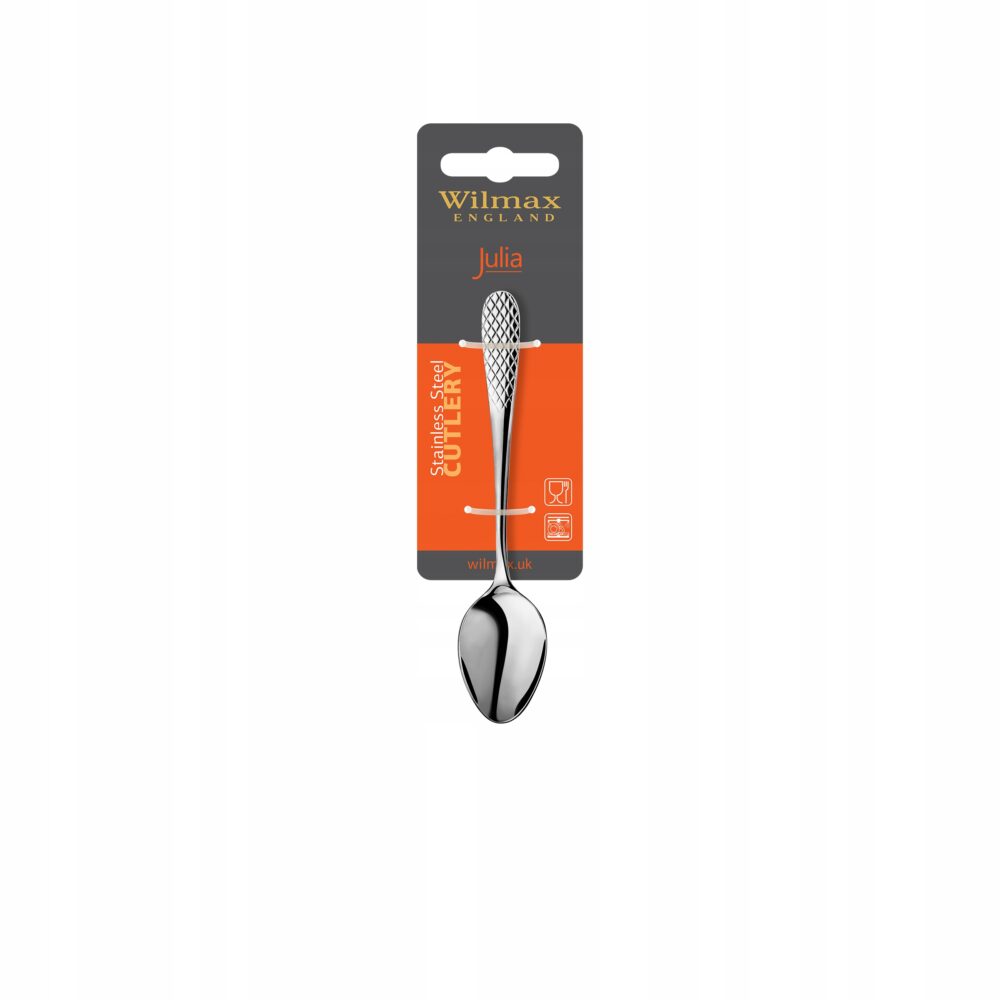 We offer a stylish tea spoon from the JULIA collection by WILMAX ENGLAND, available in an elegant set of two pieces. Each spoon with a length of 14 cm was made from high-quality 18/10 stainless steel, which ensures not only an aesthetic appearance, but also exceptional durability and corrosion resistance. Thanks to the characteristic relief pattern, the JULIA collection brings a touch of elegance to your interior, working perfectly both in everyday use and during more formal occasions.