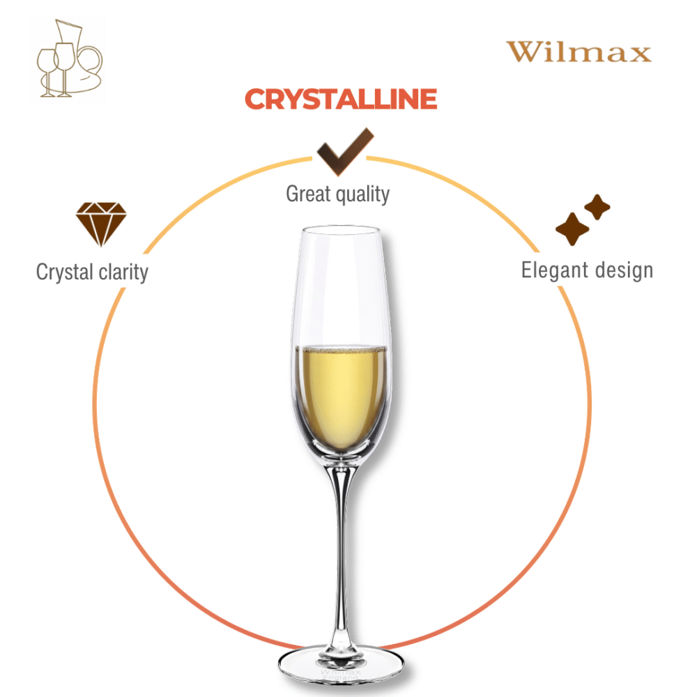 Zestaw kieliszków do szampana WILMAX to elegancka propozycja dla miłośników wyrafinowanych trunków. W skład zestawu wchodzą dwa kieliszki o pojemności 260 ml, z wyjątkowej kolekcji Crystalline. Każdy kieliszek, stworzony z wysokiej jakości szkła kryształowego, emanuje blaskiem i posiada unikalny dźwięk, co sprawia, że doskonale wpasuje się w każde wyjątkowe przyjęcie, jak i codzienną celebrację.