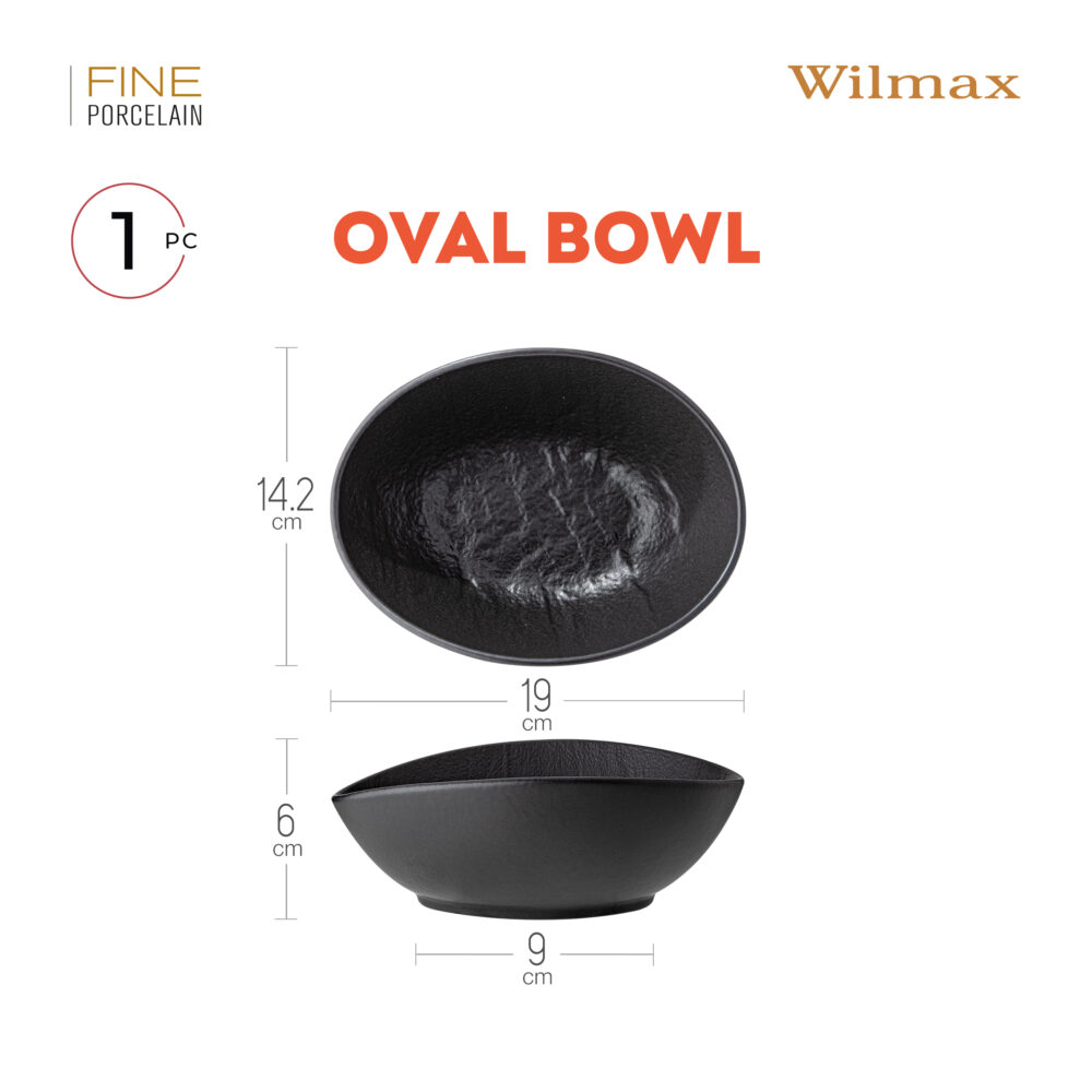 Elegancka owalna miska o wymiarach 19 x 15 x 6 cm z kolekcji WILMAX SlateStone to idealny wybór dla osób ceniących styl i funkcjonalność. W zestawie znajdują się trzy sztuki tego oryginalnego naczynia, które zachwyca swoją matową, czarną glazurą, naśladującą naturalny kamień. Miska doskonale sprawdza się w serwowaniu sałatek, przystawek oraz deserów, wprowadzając do aranżacji stołu wyjątkowy akcent.