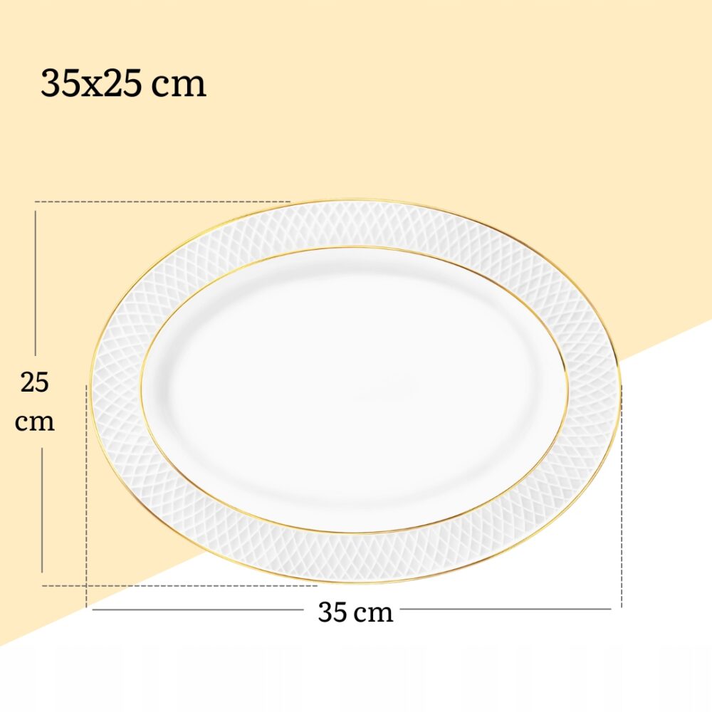 Półmisek o wymiarach 35×25 cm w eleganckim złotym odcieniu łączy w sobie nowoczesny design z klasycznym stylem, co czyni go idealnym wyborem dla osób poszukujących zarówno funkcjonalności, jak i estetyki w codziennym użytkowaniu. Wykonany z materiałów najwyższej jakości, ten półmisek zapewnia nie tylko trwałość, ale także łatwość w utrzymaniu czystości, co jest niezwykle istotne w każdej kuchni. Jego uniwersalny kształt sprawia, że znakomicie sprawdzi się do serwowania dań na rodzinnym obiedzie, a także podczas bardziej formalnych przyjęć i uroczystości. Złoty kolor nadaje mu wyjątkowego charakteru, sprawiając, że staje się nie tylko praktycznym elementem, ale również stylową dekoracją stołu, podkreślając wyjątkowość serwowanych potraw. To doskonały wybór dla osób pragnących stworzyć niezapomnianą atmosferę podczas kolacji oraz idealny pomysł na elegancki prezent dla bliskiej osoby lub luksusowy dodatek do własnej zastawy stołowej.